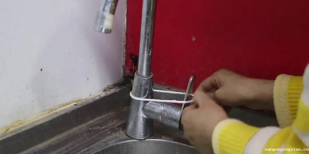 因为这个绳子的长度与我们的水龙头的这个长度刚刚好,给它固定一下。绑上之后,我们再打开开关的时候,它就不会直接把开关张到最大。水流就会变小。这种情况下,我们洗手洗菜都是不耽误的。无形当中就会节约很多的用水。
