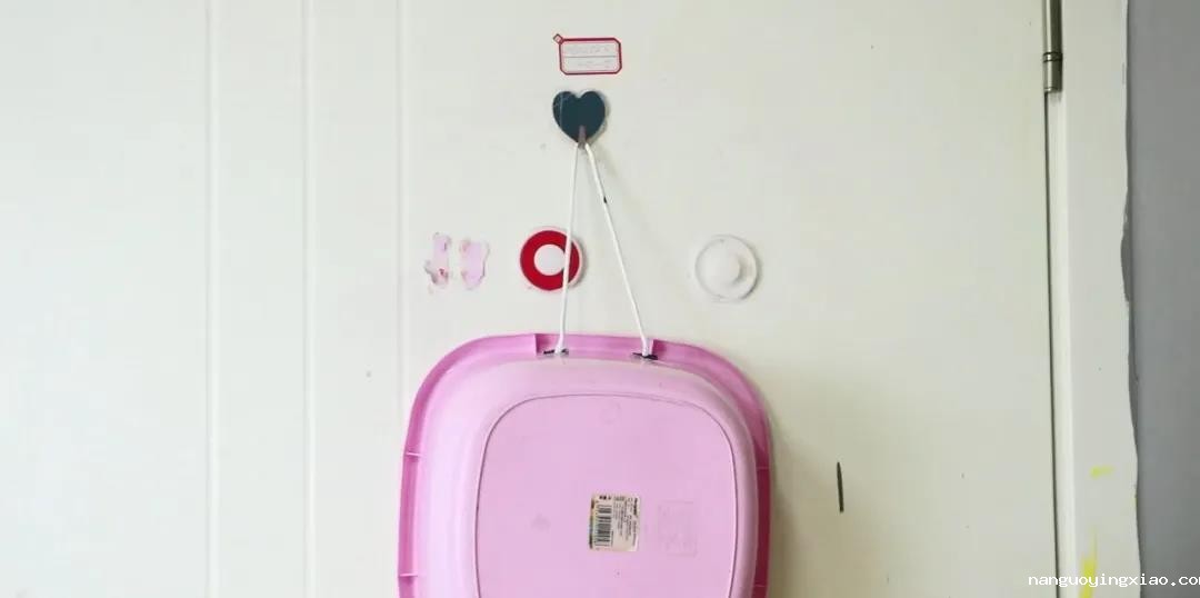 把这个绳子直接粘在盆子上。像这样粘完之后,我们等待它慢慢冷却。然后我们就可以把它挂在墙上或者是门上了。这样的情况下就可以很好的节省出地面的空间了。并且很多瓶子都这样挂起来,还会显得特别的整洁。